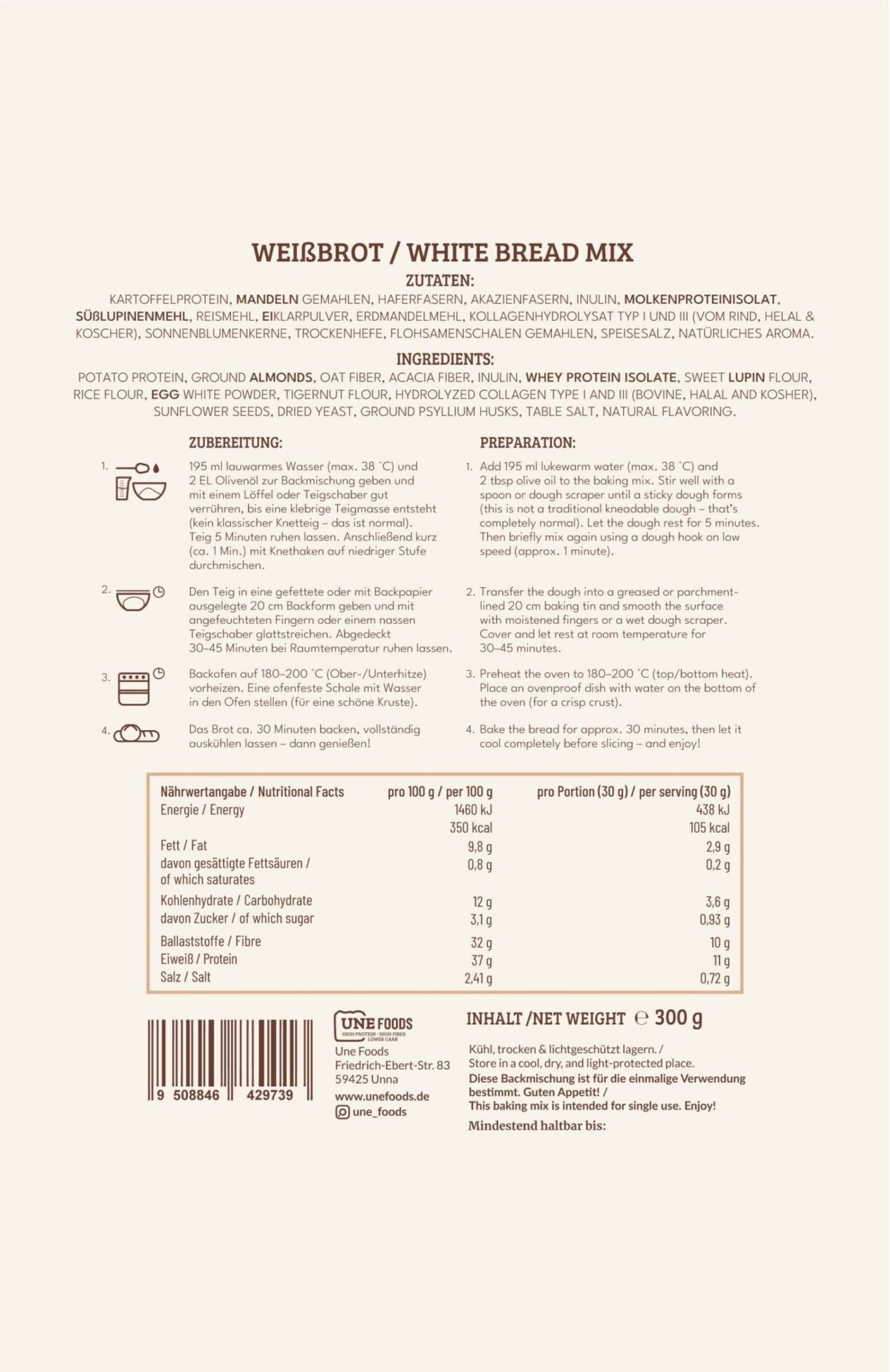 Potato protein, ground almonds, oat fiber, acacia fiber, inulin, whey protein isolate (milk), sweet lupin flour, rice flour, egg white powder, tigernut flour, hydrolyzed collagen type I and III (bovine, halal and kosher), sunflower seeds, dried yeast, ground psyllium husks, table salt, natural flavoring.